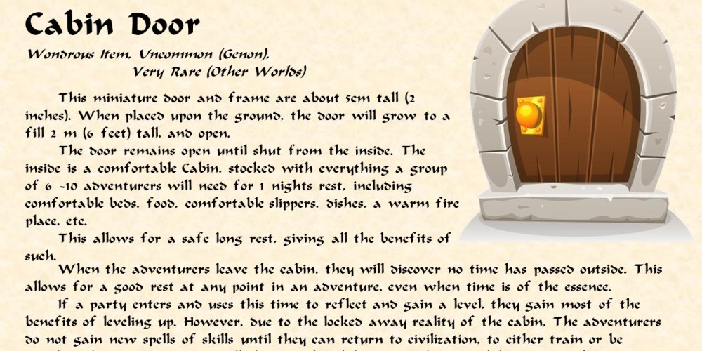 Cabin Door November 11, 2023Basic D&D (circa 1990), D&D 5e, Games, Magic Items, Original5e, BECMI, Cabin Doors, D&D, Dungeons and Dragons, Healing Items, Magic Items, Original Itemschadwickbaldwin Leave a comment This Article has Moved